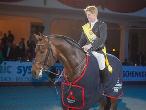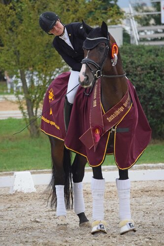 Seine Sammlung an Schärpen aus Nördlingen kann sich sehen lassen: Der in Brandenburg-Anhalt gezogene DSP De Sandro hat sich heute den vierten Titel in Folge auf der Nördlinger Kaiserwiese gesichert! Der sechsjährige Decurio/Samba Hit I-Sohn (Z.: Hans-Adolf Lembke, B. Dressurpferde Schleier) gewann mit einem glatten „Gut“ die Schärpe des Süddeutschen Dressurpferdechampions. DSP De Sandro glänzte unter Carolin Brandt mit einer souveränen Runde, die Richter hoben besonders die Schritttour als Highlight hervor. Mit der Endnote 8,0 – die in der Konkurrenz den zweiten Platz hinter Anna-Lisa Schepper und Great Gatsby BB v. Grand Passion/Grafenstolz bedeutete – qualifizierte sich das Paar auch für die Bundeschampionate in Warendorf. Mit 8,1 schafften dies auch Anna-Lisa Schepper und Great Gatsby BB.