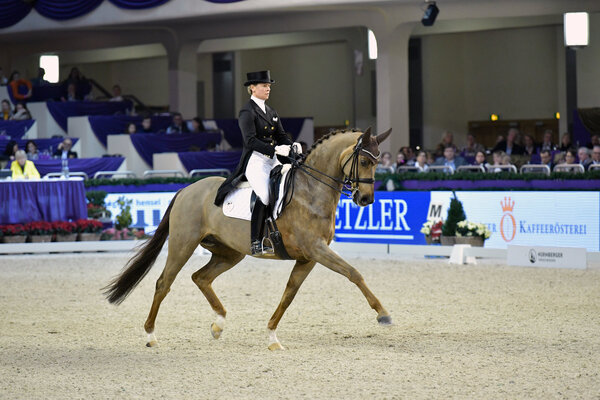 Das diesjährige Finale des Nürnberger Burg-Pokal in der Frankfurter Festhalle glich einem Schaulaufen an Hengsten. Acht der zwölf sieben- bis neunjährigen Finalisten waren Vererber - das ist eine Ausnahmequote. Am Ende setzte sich der Hengst durch, der auch schon die Einlaufprüfung gewinnen konnte: Total Hope. Der erst siebenjährige Oldenburger unter seiner Reiterin Isabel Freese ist eine Erscheinung, da kommt er ganz nach seinem Vater Totilas. Vom Gebäude ähnelt er mehr seiner Mutter - und das ist Isabell Werths Weihegold OLD v. Don Schufro. Eine sportliche Top-Kombination also. Aus der Zucht v. Christine Arns-Krogmann hatte der Rapphengst eine hohe Messlatte zu nehmen, denn vorgelegt waren 78,512 Prozent. Aber Isabel Freese, Bereiterin im Stall des Besitzers Paul Schockemöhle, hat die Nerven und Routine, eine solche Aufgabe entsprechend anzugehen. Sie setzte den Körsieger der Schwedischen Körung von 2016 glänzend in Szene und rief ein Versammlungspotenzial bei Total Hope ab, das in dem Feld seinesgleichen suchte. "Höher kann ein Pferd keine Wechsel springen", schwärmte Kommentator Christoph Hess - und in der Tat wurde auch einmal die 10 bei den Dreier-Wechseln gezogen. 79,220 Prozent waren es in Summe für Total Hope und Isabel Freese - und der Sieg. Und auch die Reiterin selbst war unglaublich glücklich: "Er lässt sich nicht so schnell beeindrucken und lernt wahnsinnig schnell. Obwohl er so viel im Deckeinsatz war, haben wir die Saison mit dem Sport bestmöglich kombinieren können. Er bietet es einfach wirklich so an." Dass Total Hope wie sein Vater die versammelten Lektionen im Blut hat, zeigte er dann auch schon beim Rausreiten: da machte der ein oder andere Passage-Tritt schon Lust auf die Zukunft.