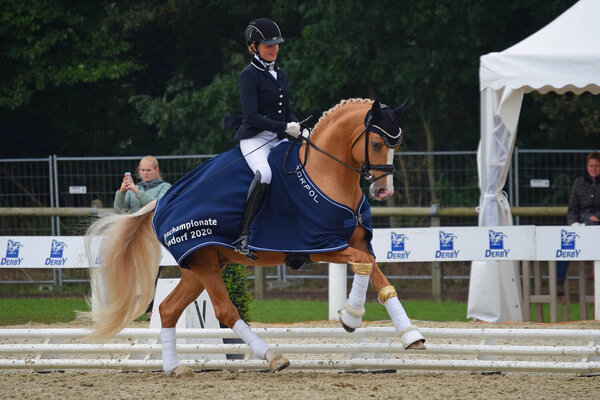 Heute lief es für Danica Duen! Erst siegte sie mit Herzrose D bei den dreijährigen Reitponystuten und -wallachen, wenig später führte sie auch die Ehrenrunde bei den dreijährigen Reitponyhengsten an. Herzzauber D, wie seine Stallkollegin abstammend von Herzkönig und auch aus einer Casino Royale K-Mutter, wurde ebenfalls von Danica Duen selbst gezogen. Der Palominohengst war letztes Jahr der strahlende Siegerhengst der süddeutschen Ponykörung. Heute beeindruckte der Hengst besonders mit seinem raumgreifenden Galopp – hier zückten die Richter eine 10,0! Insgesamt gab es eine 9,1 für ihn. Rang zwei ging an einen weiteren Siegerhengst, diesmal von der rheinischen Körung in Wickrath 2019: FS Next Diamond von FS Numero Uno-FS Don't Worry (Z.: Ferienhof Stücker, B.: Josef Wilbers) unter Marina Welbers. Für Galopp, Schritt, Ausbildung und Gebäude gab es durchweg die 9, für den Trab die 8,5 – das machte insgesamt 8,9. Rang drei war nicht minder prominent besetzt: Der gekörte George, seines Zeichens amtierender Westfalenchampion, unter Wibke Hartmann-Strommel. Der Sohn des Hesselteich's Golden Dream-FS Cocky Dundee stammt aus der Zucht von Tanja Schalkamp und steht in Besitz der Familie von Wulffen. 8,8 lautete sein Ergebnis heute.