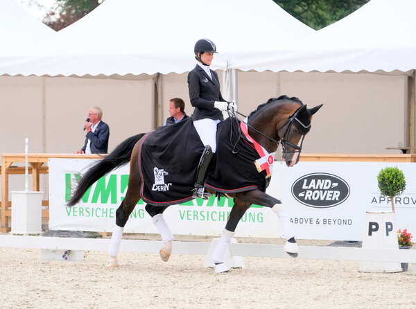 In Münster-Handorf endete gestern die Sportprüfung für vier- und fünfjährige Hengste in Dressur und Springen. Klassenprimus im Dressurlager wurde der vierjährige Escolar-Dimaggio-Sohn Ellis. Es ist nicht das erste Mal in diesem Jahr, dass der westfälische Hengst auf sich aufmerksam macht. Ellis (Z.: Walter P.J. Droege, A.: Johann Hinnemann) verpasste in Warendorf nur knapp den Finaleinzug unter seiner Ausbilderin Stefanie Wolf. Zuvor konnten sich die beiden in Münster-Handorf den Titel Westfalenchampion sichern und auch seinen 14-Tage-Test in Adelheidsdorf beendete der Hengst im Frühjahr mit sehr guten Noten (Dressur: 9,09, Gesamt: 8,5). Die Höchstnote erzielte Ellis nun wieder einmal für seinen herausragenden Schritt (in Warendorf gab es hier die 9,0) – eine glatte 10,0 zückten die Richter in Münster. Für Rittigkeit und Gesamteindruck gab es eine 9,2, Galopp 8,8 und Trab 8,4, macht insgesamt 9,12. Bester fünfjähriger Hengst in der Sportprüfung Teil II war Kardam’s Whisper (A.: Glock HPC NL BV) unter Eva Möller. Der KWPN-Hengst ging für den Hannoveraner Zuchtverband an den Start. Der Sohn des Toto jr.-Sir Sinclair erreichte eine Endnote von 9,1.