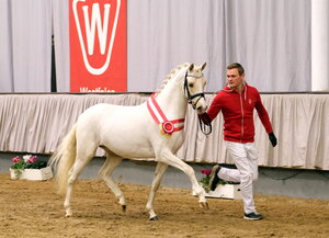 Nach der Reitpferdekörung folgt in Münster-Handorf traditionell die Körung der Ponys und Kleinpferde. Zum Sieger bei den Reitponys avancierte ein Sohn des Golden Grey NRW, aus einer Bodyguard P-Mutter. Gezogen wurde der Palomino von Mareike Mertensmeier, als Aussteller trat die BG Daniel Münter und Sabine Nixtatis auf. „Ein Pony versehen mit ganz viel Adel und Charm, ausgestattet mit drei überragenden Grundgangarten. An diesem Wochenende das kompletteste Pony, das auch in der Galopparbeit an der Longe mit genügend Tragkraft und Raumgriff überzeugte und sich heute im Freispringen sehr souverän präsentierte“, so der kommissarische Zuchtleiter Thomas Münch.