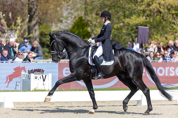 Auch das erste Ticket für den Nürnberger Burg-Pokals 2022 gab es zu gewinnen. Wie schon in der Qualifikation am Samstag belegte Susan Pape (GBR) mit dem imposanten Vivaldi-Sohn V-Plus den ersten Platz und der Endnote 74.268 Prozent. Pape war mehr als zufrieden mit dem Oldenburger Hengst (Z.: Gestüt Lewitz, B.: Harmony Sporthorses), der ja im Doppeleinsatz ist und sich auch züchterisch schon wunderbar vererbt. “Ich bin eigentlich mit der Erwartung hierher gekommen, ein bisschen mehr Vertrauen ins Viereck zu bringen. Das hier jetzt zwei solche Prüfungen rausgekommen sind, damit habe ich nicht gerechnet. Ich bin überglücklich!Die Finalprüfung war ähnlich zur Prüfung gestern. Er wollte nicht stehen bleiben, er wollte los. Er lässt sich wunderbar reiten, wenn er aber noch etwas stärker wird, sieht es wahrscheinlich auch noch eindrucksvoller aus.” Der zweite Platz, mit nur 0,177 Prozent Abstand ging an den Hof Kasselmann Reiter Frederic Wandres mit Dolciario v. Danciano. Drei Richter sahen dieses Paar vorne, am Ende gab es 74.097 Prozent. Wandres plant seinen nächsten Start der Nürnberger Burg-Pokal Etappe beim Pferdefestival Redefin vom 13. - bis 15. Mai. Andreas Politycki, Mitglied des Vorstands Vertrieb der Nürnberger Verischerung, war bereits zum zweiten Mal bei Horses & Dreams dabei: “Hagen ist von der Größe her sehr vielfältig, einen besseren Startplatz für den Nürnberger Burg-Pokal man sich nicht vorstellen, auch mit dem was hier geboten wird.”  (PM/mst)