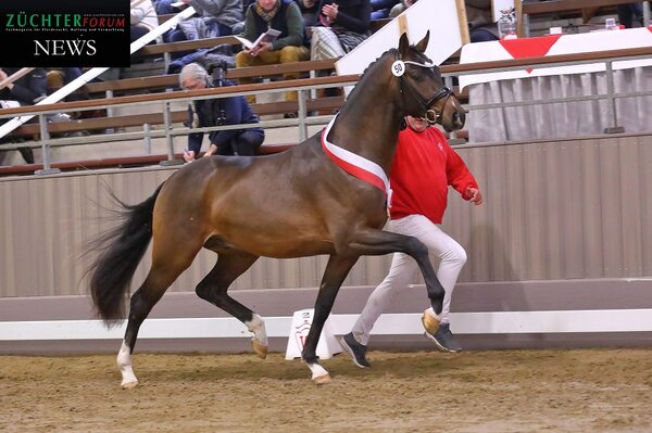 Über alle Zweifel erhaben zeigte sich der Siegerhengst, der nach seinen gelungenen Auftritten bei der Pflastermusterung und dem Longieren am Sonntag, auch am Montag zu überzeugen wusste. Der Sohn des Viva Gold aus einer Tochter des Fidertanz, der bei Bernd Goeke (Hamm) das Licht der Welt erblickt hatte, überzeugte am Montag Körkommission wie Publikum gleichermaßen. In der anschließenden Auktion wurde der bewegungsstarke Braune für nicht weniger als 1.200.000 Euro von Pferdehändler und Dressurausbilder Andreas Helgstrand (Dänemark) erworben.