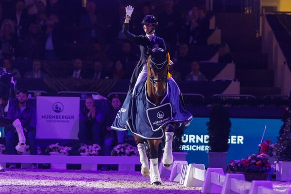 Das Publikum konnte es kaum mehr erwarten, seinen Sieger frenetisch zu feiern: Schon vor dem Schlussgruß begann die Menge rhythmisch zu klatschen. Andrina Suter und Briatore NRW toppten wie bereits in der Einlaufprüfung die Konkurrenz. Die Jury vergab sagenhafte 77,926 Prozent. Das war der klare Sieg für die 30-jährige Dressurausbilderin aus der Schweiz und den ehemaligen Silbermedaillengewinner beim Westfalen-Championat 2019. Lediglich eine kleine Störung in der Trabtour erlaubte sich das hochdekorierte Paar, welches die Qualifikation in Mannheim gewonnen hatte, sonst punktete der erst siebenjährige Nachkomme des Belissimo – Dresemann aus der Zucht von Adolf Theo Schurf unter dem Sattel seiner Ausbilderin durch und durch mit einer harmonischen Vorstellung. „Eigentlich sollte Briatore hier nur etwas Erfahrung sammeln, aber nun hat er meinem zweiten Pferd irgendwie die Show gestohlen“ freute sich Andrina Suter im Anschluss über ihren siebenjährigen Wunderknaben. Doch damit nicht genug, die Schweizerin, die bei Oliver Oelrich trainiert, durfte sich auch über Rang zwei freuen. Dort platzierte sie den neunjährigen Hannoveraner Del Curto, ein Sohn des Dimaggio – Wolkentanz II aus der Zucht von Hendrik Moss mit 76,097 Prozent.