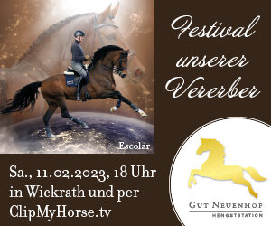 Kollektions-Newcomer, ein besonderes Ambiente, stimmungsvolle Musik und wichtige Persönlichkeiten der Pferdewelt: Mit dem „Festival der Vererber“ bieten wir Ihnen einen unvergesslichen Gala-Abend, und das zum ersten Mal seit der Corona-Pause wieder vor Ort und hautnah. Sie sind herzlich sind eingeladen, die Veranstaltung gemeinsam mit uns am Samstag, 11. Februar 2023, um 18 Uhr live auf Schloss Wickrath oder digital auf www.clipmyhorse.tv zu erleben. Im Anschluss wird die Aufzeichnung des Festabends in der Mediathek von ClipMyHorse verfügbar sein.