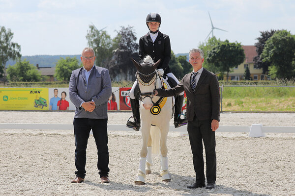 Das Hohenloher Pony Dressur Event ist an diesem Wochenende auch Austragungsort der Landeschampionate der fünf- und sechsjährigen Dressurponys. Am Samstag waren zunächst die Fünfjährigen an der Reihe. Die Dressurponyprüfung der Klasse A war zugleich eine Qualifikation zum Bundeschampionat in Warendorf. Mit der schwarz-gelben Schärpe dekorierte der 1. Vorsitzende des Pferdezuchtverbandes Baden-Württemberg, Eddy Schuster, die neue Landeschampionesse: die Golden West-FS Dior de Luxe-Tochter Glücksfee (Z.: Karl und Martina Geiselhart) unter ihrer Besitzerin Victoria Sophie Zimmerer. Glücksfee ist keine Unbekannte. 2021 zeigte sich unter ihrer Ausbilderin Miriam Grötzinger zwei gute Runden im Landeschampionat der dreijährigen Reitponystuten und -wallache und drehte im gleichen Jahr auch im Warendorfer Viereck ihre Runde. Zuvor hatte sie bereits eine sehr gute Stutenleistungsprüfung in Marbach, mit einer Endnote von 8,25 abgelegt. Letztes Jahr trat die Stute dann auch ohne Sattel in Erscheinung: Bei Freilauf- und Freispringwettbewerb in Marbach konnte sie die Abteilung „Doppeltalent“ bei den Vierjährigen für sich entscheiden. Ihr doppelte Veranlagung bewies Glücksfee in der letzten Saison auch unter dem Reiter, hier sammelte sie Schleifen in Dressur- und Springpferdeprüfungen der Klasse A. Gestern zeigten Victoria Sophie Zimmerer und Glücksfee eine ansprechende Runde, lediglich ein geregelteres Tempo hätte der Vorstellung gut getan. Für den Schritt gab es eine 7,5 der Galopp war zwar mit aktivem Hinterbein gesprungen, allerdings war die Schwebephase aufgrund des hohen Tempos recht wenig ausgeprägt (7,0) Der Trab war fleißig, allerdings auch eher eilig (7,0). Mit einer Endnote von 7,0 reihte sich Glücksfee auf Rang fünf der Prüfung ein. Gewonnen wurde die Prüfung mit einer Endnote von 7,8, die gleich zwei Paare erreichten: Jana Reichl und Van Tini, sowie Maya Wächter mit Dancing Casanova.