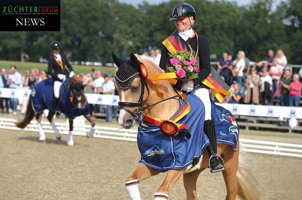 Die erste Titelentscheidung der diesjährigen Bundeschampionate fiel schon heute Morgen auf dem Reitpferdeviereck. An der Reihe waren zunächst die dreijährigen Reitponystuten und -wallache. Als erstes Pferd der ersten Gruppe betrat die in Weser-Ems gezogene Stute Kastanienhof Roxette v. Crown Notting Hill-Kastanienhof Cockney Cracker (Z.+B.: Gestüt Kastanienhof) unter Hanna Richter die Bahn. In der Qualifikation bewies sie bereits mit einem zweiten Rang ihre Qualität. Heute legte sie noch eine Schippe drauf. Gerd Sickinger lobte in seinem Kommentar besonders den Schritt: super losgelassen, wunderbar schreitend, mit genügend Zug nach vorn und stets in einem unerschütterlichen Viertakt - 9,0. Die glatte 9,0 gab es auch für die Rittigkeit: Die Stute zeigte Takt, Losgelassenheit und Anlehnung in schöner natürlicher Selbsthaltung. Im Trab überzeugte sie durch wunderbares Durchschwingen durch den Körper bei sicherer Anlehnung, 8,5, der Galopp war ausbalanciert und sicher im Takt, lediglich etwas mehr Bergauf-Tendenz wünschte man sich, 8,0. Für das Exterieur gab es ebenfalls die 8,0, die Stute ist in einem schönen Rechteckformat angelegt, könnte aber noch etwas mehr Substanz im Rücken vertragen - bei einer dreijährigen Stute allerdings noch kein Grund zur Besorgnis. Mit einer Endnote von 8,5 legte Kastanienhof Roxette damit nicht nur die Messlatte hoch, nein, es sollte am Ende sogar der Titel werden! Vizechampion wurde der Sieger der Qualifikation, der für das Westfälische Pferdestammbuch startende Top Casanova v. Top Champion-Der feine Lord AT (Z.: Werner Leusmann, B.: Greta und Carlotta Kühnhenrich) unter dem Sattel von Greta Kühnhenrich. Für den Trab und die Rittigkeit erhielt er jeweils eine 8,0, alle anderen Kriterien wurden mit 8,5 bewertet - macht eine 8,3 im Endergebnis. Bronze ging an ein weiteres Pony unter dem Sattel von Hanna Richter: Didgeridoo NE WE v. Kastanienhof Donnertrommel-Davenport II (Weser-Ems, Z.: Nadine Elias, B.: Svenja Richter) mit 8,2.