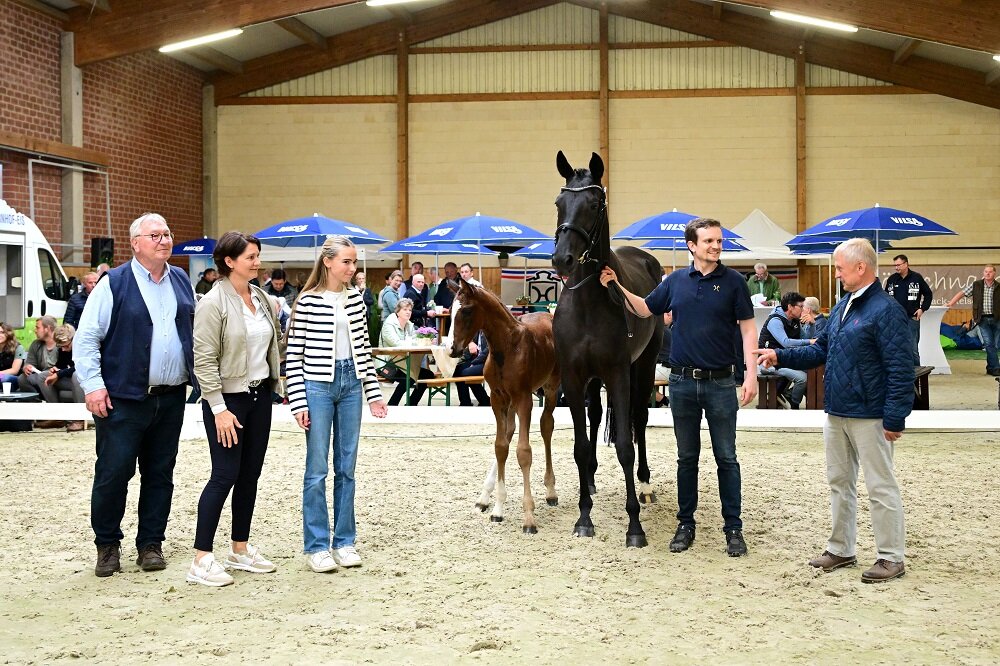 Auf dem Zuchthof Hollen im niedersächsischen Oyten-Bassen bei Bremen, ging am Sonntag ein Pilotprojekt das die Verbände Holstein und Hannover miteinander verbindet bereits in seine vierte Auflage. Das Team um Betriebsleiter Günther Friemel hatte gemeinsam mit dem Hannoveraner Pferdezuchtverein Achim und dem Holsteiner Verband auf der mustergültig präparierten Anlage des Zuchthof Hollen die gemeinsame Fohlenschau für Fohlen der Stutbücher Hannover und Holstein organisiert. Dabei galt es auch dem Wetter zu trotzen, doch kurzentschlossen wurde der gesamte Aufbau von den Außenanlagen in den Hallenkomplex verlegt, so dass die ausgesprochen zahlreichen Besucher gemütlich im trockenen einen angenehmen Pferdenachmittag mit bestens herausgebrachten Fohlen, einer umfassenden kulinarischen Rundum-Versorgung und familienfreundlichem Begleitangebot wie Hüpfburg und Kinder-Ponyreiten genießen durften. Diese ursprünglich als Pilotprojekt gestartete Veranstaltung hat in den vergangenen Jahren ein stetiges Wachstum erlebt und entwickelt sich zunehmend zu einem Place-to-be-Event in der Region. Viele bekannte Persönlichkeiten der norddeutschen Pferdezuchtregionen ließen sich denn auch im Publikum entdecken, so beispielsweise das Ehepaar Eva und Ulf Möller, die Familien Britta & Hannes sowie Bettina & Philipp Baumgart, Karola und Norbert Boley, oder auch das Ehepaar Amai Kummrow-Rodekohr und Fritz Kummrow. Besonders Amai Kummrow-Rodekohr hält der Veranstaltung als treue Sponsorin mit dem Familienunternehmen Vilsa-Brunnen von Beginn an die Treue. Weitere, großzügige Sponsoren mit regionalem Bezug verdeutlichen die positive Außenwirkung dieser Veranstaltung. Freuen durften sich die zahlreichen Besucher über 51 im Katalog verzeichnete Fohlen, von denen die meisten den Wetterbedingungen zum trotz auch antraten.