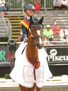 Auf dem dritten Platz rangierte im Finale der Sieger der zweiten Abteilung der Finalqualifikation, Dante’s Sunrise (v. Dante Weltino – Fürstenball, Z.: Sabine Reisenauer) unter dem Sattel von Ines Fleischmann. Der DSP-Wallach zeigte sich heute sogar noch energischer und selbstsicherer als in der Finalqualifikation und so lobte Nicole Nockemann gleich zu Beginn der Prüfung: „Der Wallach ist ein unglaublich dynamisches Pferd mit sehr viel Grundschwung im Trab und einem kraftvollen Ablauf“. Auch zeigte sich Dante’s Sunrise in allen Trabtempi sehr ausbalanciert, wobei sich in einer Volte eine kleine Unsicherheit im Genick zeigte. Auch wünschten sich die Richter eine noch bessere Maultätigkeit. Im Trab stand schlussendlich eine 8,8. Für den raumgreifenden und gut schreitenden Schritt vergaben die Richter eine 8,7 und wünschten sich hierbei zu Beginn und am Ende der Schrittsequenz ein noch losgelassenes Schreiten. Der Galopp überzeugte mit toller Bergauftendenz und kraftvoll durchspringend (8,8). In der Durchlässigkeit wünschten sich die Richter im Außengalopp ein noch klareres Spuren. Auch ergab ein nicht ganz klar gegebener Viertakt in der Kurzkehrt Abstriche (8,2). Die Note für die Perspektive von 8,5 komplettierte die Gesamtnote von 8,6. Ein toller Erfolg für die Baden-Württembergerin und den aus Baden-Württemberg stammenden DSP-Wallach.