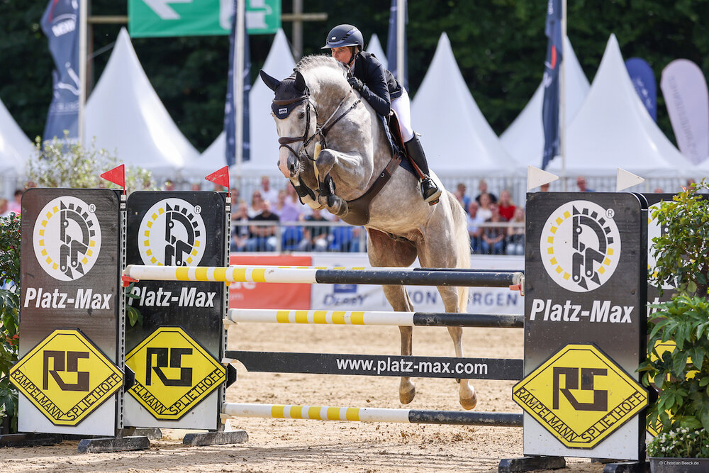 Dir Silbermedaille ging an die Warendorferin Jana Fink, für die es quasi ein Heimspiel war: 8,8 und 9,3 gab es für die Vorstellungen mit dem kraftvoll abdrückenden Hannoveraner Comme mon Père (v. Comme il faut-Quintender-Acord II-Wendekreis-Grande-Royal Palm xx, Z.: Heinz-Wilhelm von Thaden, Stade). Der stets energisch galoppierende Dunkelbraune geht auf einen reinen Vollblutstamm zurück und wurde im Frühjahr vom Westfälischen Pferdestambuch gekört.