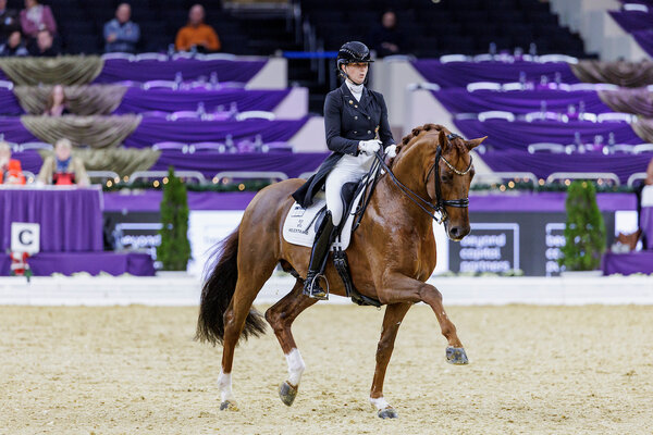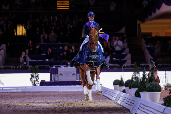 Gleich zum Auftakt der Prüfung überzeugten die beiden mit einer enorm ausdrucksstarken Trabtour, wobei die weit kreuzenden Trabtraversalen sowie die Verstärkungen mit hoher Schubkraft hervorzuheben sind. Auch im Schritt fand Vitalos FRH sofort zur optimalen Losgelassenheit und punktete ebenso mit großem Übertritt. Im Galopp überzeugte Vitalos FRH in den Galopppirouetten mit größter Versammlungsfähigkeit. Teilweise fand er hier noch nicht zur optimalen Losgelassenheit, was aber wahrlich Meckern auf allerhöchsten Niveau war. Dies spiegelte auch das Ergebnis von 74,4 Prozent wider. Schlussendlich reihte sich das Erfolgsduo auf einem bärenstarken dritten Platz ein. Der Sieg ging an Dorothee Schneider mit Maxi Kraft’s Barcelo (76,7 Prozent) (v. Bon Coeur-Caprimond, Z.: Kristine Munch Nielsen) vor Juliane Brunkhorst mit DSP Diamante Negro (v. DeLorean-Fürst Romancier, Z.: ZG Krohn und Dötschel) (75,5 Prozent). Der große Triumph für Leonie Richter und Vitalos FRH folgte dann im Siegerpreis, einer S*-Kür für die besten Drei aus dem Finale. Schon im Vorhinein hatte Leonie Richter geschmunzelt: „Ich freue mich auf die Kür. Vitalos kennt solch eine Atmosphäre von den Hengstvorstellungen“. Und die beiden zelebrierten die S*-Kür am kleinen Finger. Das Frankfurter Publikum feierte sie und „trug“ sie zu einer 9,2, womit sich Leonie Richter gegen Dorothee Schneider mit Maxi Kraft’s Barcelo OLD durchsetzte. Der Finalsieger verlor durch leichte Spannung in der Galopptour ein paar Punkte, beendete die Kür dennoch mit einer tollen 9,1. Juliane Brunkhorst und DSP Diamante Negro folgten mit einer 9,0 auf Rang drei. Alles in allem überzeugten alle drei Damen mit äußerst gefühlvollen Runden. Es war nicht das erste Mal, dass Leonie Richter und Vitalos FRH überzeugten. Schon bei den Weltmeisterschaften der jungen Dressurpferde hatten sich die beiden sowohl bei den fünfjährigen Dressurpferden als auch ein Jahr später bei den sechsjährigen Dressurpferden den Vizetitel gesichert. 2021 hatte Vitalos FRH das Bundeschampionat der vierjährigen Hengste angeführt.
