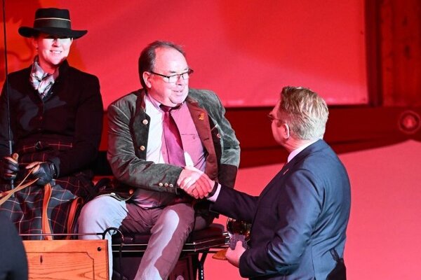 Schwolow, der 2021 ebenfalls mit der Gustav-Rau-Medaille ausgezeichnet wurde, hat sich durch sein Engagement in der Ponyzucht, der Reitausbildung und seine ehrenamtliche Arbeit einen Namen gemacht. Neben seiner Tätigkeit als Gestütleiter baute Schwolow sich in seiner Heimat in Dallgow im Havelland einen eigenen Pensions- und Reitbetrieb auf und machte sich vor allem durch seine erfolgreiche Ponyzucht und -hengsthaltung einen Namen. In seinem ehrenamtlichen Engagement war er zunächst als Vorstand für die Ponyzucht in Berlin-Brandenburg und nachher Stellvertretender Vorsitzender des neugegründeten Verbandes Brandenburg-Anhalt. Seit acht Jahren ist Detlef Schwolow auch im Vorstand der AG Deutsches Sportpferd aktiv und betreut bis heute beim DSP als Vorsitzender der Abteilung II den Bereich Ponys, Kleinpferde und Spezialrassen. Auch wenn Schwolow selbst entschied bei den kommenden Neuwahlen nicht mehr für das Amt zur Verfügung zu stehen, wollte das DSP-Team ihn gebührend verabschieden. Und so erhielt Detlef Schwolow, begleitet vom frenetischen Applaus seiner DSP-Freunde, die höchste Auszeichnung, die DSP zu vergeben hat: Carsten Grill, Vorsitzender der AG Deutsches Sportpferd und Stellvertretender Vorsitzender des FN-Bereichs Zucht, steckte ihm die DSP-Ehrennadel in Gold ans Revers.
