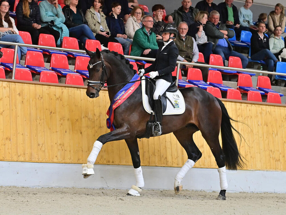 Der Reserve-Siegerhengst Invictus Negro, geb. 2022, v. Ibiza Dream a.d. Finesse v. Florestan I - Rubinstein I - Weltmeyer, Z.: Simone Weidenhöfer, Bergen, A.: Marvin Klausing, Diepholz, wurde für 75.000 Euro an den Stall von Rom Vermunt aus den Niederlanden zugeschlagen. Der Rappe kommt in weltmeisterlichen Beritt. Aus dem Stamm kommen u.a. die gekörten und Grand Prix-erfolgreichen Freudentänzer v. Franziskus/Ingrid Klimke und Damon Hill v. Donnerhall/Helen Langehanenberg.