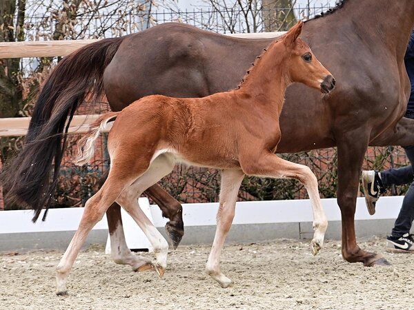 Dynamic Pur, Sieger der Hengstleistungsprüfung in Vechta, präsentiert mit Dynamic Renard ein vielversprechendes Hengstfohlen aus seinem ersten Jahrgang. Die Mutterlinie brachte bereits zahlreiche erfolgreiche Vererber wie Signore Rubinstein und Sirano de Luxe hervor.