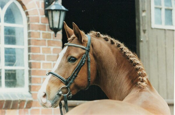 Heidbergs Nancho Nova v. Night Cup MV: Mambo Moscan wurde 1998 bei Sylvia Osmer in Bremen geboren. Im Besitz von Jan Lindemann, Lilienthal entwickelte sich der charmante Fuchs mit der leuchtend roten Jacke zu einem wahren Stempelhengst der hannoverschen Ponyzucht. 2000 mit Prämie gekört, verließ er Warendorf 2001 als 3 jähriger mit Bronzetitel. 2001 und 2002 war Nancho Landeschampion Hannover. 2002 folgte die Leistungsprüfung in Radegast mit einer hervorragenden 8,95. Besonders hervor stachen Rittigkeit, Umgänglichkeit und Freispringen, was jeweils mit einer 10 belohnt wurde. Bereits aus seinen drei ersten Fohlenjahrgängen konnte er 10 gekörte Söhne stellen, unter ihnen der zweimalige Bundeschampion Noir de Luxe. Durch diese Zuchterfolge wurde Nancho Nova bereits 7 jährig Elitehengst. Eine herausragende Leistung!
