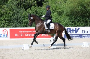 „Ich musste mich beherrschen, dass ich nicht mitsinge, denn ich liebe diese Kür, die passt perfekt zu uns beiden, es hat riesig Spaß gemacht“, sagte Moritz Treffinger nach seinem Auftritt mit Cadeau Noir in der U25 Deutschen Meisterschaft. Wie schon im U25-Grand Prix am Freitag sicherten sich die beiden in Balve eine weitere Goldmedaille. Dabei merkte man ab Sekunde eins, dass die beiden Kürreiten lieben oder wie Moritz Treffinger seinen Hengst liebevoll beschreibt: „„Es war von Anfang an klar, als es darum ging, eine Kür mit Cadeau zu reiten, dass es eine Backstreet Boys-Kür werden muss, er ist einfach ein Backstreet Boy und einfach eine Rampensau“. Der 15-jährige Hannoveraner Hengst überzeugte vor allem in den Galopppirouetten, den Passagen und den Zweierwechseln. Kleine Abstriche mussten teilweise in den nicht ganz ausbalancierten Piaffen und mit Fehlern in den Einerwechseln gemacht werden. Letzteres nahm Treffinger zugleich auf seine Kappe: „Am Ende war Cadeau ein bisschen übermütig. Er war so frisch, ich hätte ihn vor den Einer-Wechseln noch ein bisschen mehr aufs Hinterbein holen können, das war mein Fehler“. Dennoch befanden sich die beiden fast schon in einer eigenen Liga und sicherten sich überlegen mit 76,2 Prozent den Sieg.