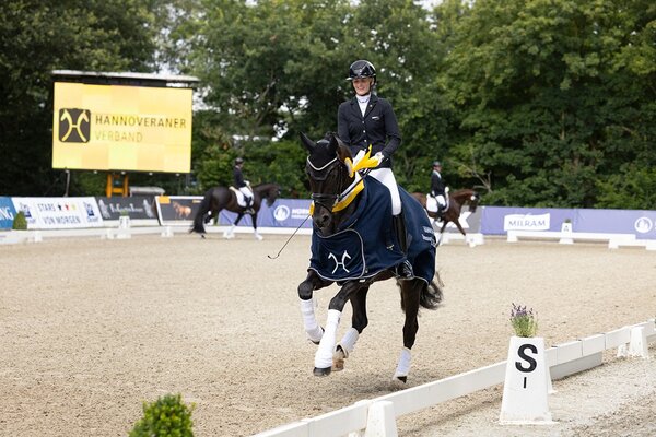 Einen Tag später feierte Leonie Richter ihren zweiten Titel bei den Hannoveraner Championaten, diesmal im Sattel des sechsjährigen Jupiter BC v. Jovian/Fürst Romancier (Z.: Gestüt Greim, Bärnau). Der ausdrucksstarke Dunkelbraune absolvierte damit zugleich eine HLP-Wertungsprüfung. Er gewann vor Donicio v. Don Martillo/Benicio (Z.: Horst Rosenblatt, Bochum), der einst über die Verdener Fohlen-Auktion einen neuen Besitzer fand. In Elmlohe wurde er von Melanie Klein präsentiert. Die Dressurreiterin aus Schleswig-Holstein holte sich im Sattel von Designer v. Da Costa/Don Frederico (Z.: Bernd Hinck, Deinstedt) als Dritte ihre zweite Schleife.
