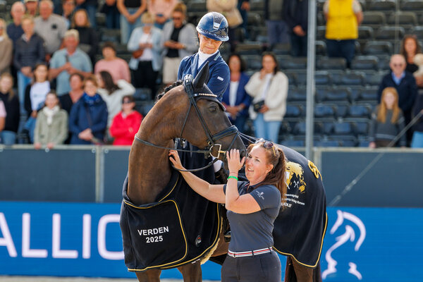Mit drei Jahren hat Alexandra Vordermair den Escamillo-Sohn Exact genau hier in Verden gekauft und hat sie mit in ihre neue Heimat Australien genommen. Zwei Jahre später wurde Exact australischer Jungpferde-Vize-Champion der Fünfjährigen, 2025 sicherte er sich bei den Sechsjährigen den Champion-Titel. Kurz danach, im März dieses Jahres, siedelte Vordermair, die inzwischen für Australien reitet und die australische Staatsbürgerschaft angenommen hat, wieder zurück nach Deutschland. Exact und sie sind seither auf dem Fichtenhof ihrer Zwillingsschwester Andrea und deren Mann Arnaud Petit zu Hause und trainieren mit Ferdinand Csaki. „Wir haben die vergangenen drei Jahre auf dieses Ziel, auf diesen Traum hingearbeitet, hier heute dabei sein zu dürfen“, strahlte die Reiterin. „Und es war grandios!“ Beim Schlussgruß war die Freude nicht mehr zu bremsen, Alexandra Vordermair riss die Arme in die Höhe, jubelte euphorisch und verpasste Exact unzählige Küsschen. Mit Platz 15 und 81 Prozent hat es nicht ganz für den direkten Einzug ins Finale ausgereicht. Die besten zwölf Pferde aus der Qualifikation kommen weiter. Aber am Donnerstag steht für die Sechsjährigen, die nicht direkt den Sprung ins Finale geschafft haben, das sogenannte Kleine Finale auf dem Programm. Die besten Drei des Kleinen Finals ergattern ebenfalls noch je ein Ticket für den Samstag, wenn es dann um WM-Medaillen und Titel geht.