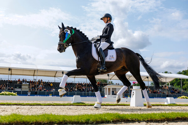 Nur einer Reiterin ist es gelungen, gleich zwei Pferde für das Finale der Sechsjährigen am Samstag zu qualifizieren: Greta Heemsoth. Mit dem Escolar-Sohn Endorphin FRH, belegte die Bereiterin aus dem Stall Pape Platz vier mit 87,80 Prozent, mit Felice FRH wurde es Platz acht mit 84,60 Prozent. Beide Pferde haben bereits im vergangenen Jahr bei den Bundeschampionaten auf sich aufmerksam gemacht. Die Hannoveraner Stute v. Fürst Samarant hatte sich den Titel Bundeschampioness verdient, Stallkollege Endorphin wurde Vize-Bundeschampion. Für Greta Heemsoth ist es die erste Teilnahme an einer WM und sie war begeistert: „Ich bin sehr zufrieden mit beiden Pferden. Sie sind so unterschiedlich, aber beide haben sich sehr gut gezeigt heute. Obwohl, das ein oder andere geht auch noch ein bisschen besser“, ergänzt sie schmunzelnd. Mit beiden Pferden war heute der erste fliegende Wechsel in der Aufgabe nicht gelungen. „Endorphin macht gerne auf sich aufmerksam, er hat sehr viel Präsenz, auf der anderen Seite ist er ganz einfach und fein zu reiten. Felice ist sehr schüchtern und sehr sensibel. Sie braucht immer jemandem, dem sie wirklich vertrauen kann, der sie an die Hand nimmt und ihr sagt ‚Du kannst das‘.“ Die 32-Jährige ist in Verden aufgewachsen und freut sich auf das Finale in der Horse24-Arena am Samstag. „Da werden mich sicher einige Freunde und meine Familie anfeuern.“