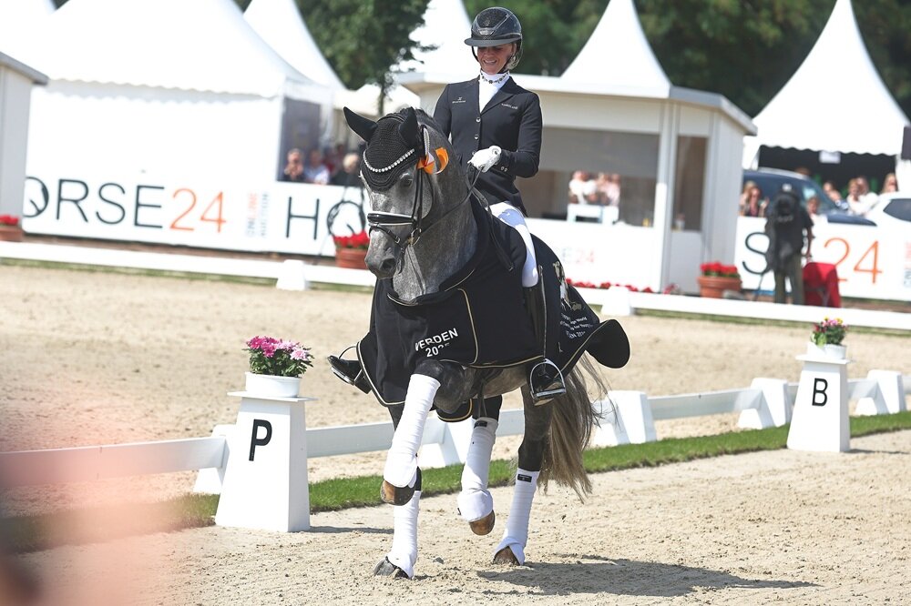 Lange hatte die Führung in der ersten Qualifikation der Fünfjährigen in Hand einer oldenburgisch/deutschen Doppelspitze gelegen. Nach jeweils hervorragenden Runden lagen Linda Weiß und Viva Diamond OLD sowie Merita Hagren mit Ferdinand de Fontaine dichtauf an der Spitze des Feldes. Dann kam als fünftletzter Starter der KWPN Schimmelhengst Proud James von Jameson RS2 – Johnson (Z.: Y.M.M. Van Maasacker, B.: Helgstrand Dressage A/S) mit seiner Reiterin Mette Sejbjerg Jensen in das Verdener Viereck getrabt. Den beiden gelang in der Prüfung nahezu alles. Mit zweimal der 8,8 (Schritt und Gehorsam) sowie zweimal der 9,0 (Trab und Galopp) und einer 9,2 für die Perspektive wurde das Duo für seinen Vortrag belohnt. In der Addition stand eine Endnote von 89,600%, was den deutlichen Sieg in dieser Prüfung bedeutete.