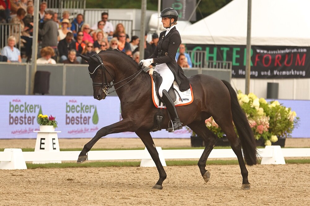 „Die Entwicklung, die dieses Pferd in den vergangenen zwölf Monaten gemacht, begeistert mich“, sprudelte es aus der Reiterin des Siegers, Leonie Richter. „Ich habe Nero vor einem Jahr in Beritt bekommen, damals konnte er noch nicht besonders viel. Er hat so eine tolle Arbeitseinstellung, dazu kommen seine Ausstrahlung und Schönheit – er hat uns heute sehr stolz gemacht.“ „Nero“ sei im Kleinen Finale gerade im Schritt schon entspannter gewesen als in der Qualifikation. „Der Schritt war trotzdem noch nicht so wie er sein kann, er hat einen 8er Schritt, aber das konnte er hier in der WM-Arena noch nicht zeigen.“ Er bekam für den Schritt eine 6,8. „Heute war auch der Trab schon viel schöner im Fluss und durch den Körper, das war am ersten Tag alles noch etwas wackelig“, resümiert Leonie Richter weiter. „Der Trab vermittelt sowieso ein tolles Gefühl. Man muss sich nur einmal hinsetzen und anspannen, dann schließt sich das ganze Pferd und fängt an zu schwingen.“ Im Trab gab es die 8,8, der Galopp wurde mit 8,9 bewertet, die Durchlässigkeit mit 8,3 und die Perspektive mit 8,4, so dass die Qualitätsnote am Ende 82,40 betrug. Für die technische Ausführung der Lektionen erhielt der Sieger 71,429 und 71,964 Prozentpunkte. Das Gesamtergebnis: 77, 049 Prozentpunkte.
