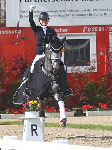 Die kommentierende Richterin Maria Colliander aus Finnland schwärmte: „Der Trab ist sehr aktiv, sehr elastisch, sehr gut in der Balance und mit gut schwingendem Rücken.“ Ausgedrückt in der Note wurde die richterliche Begeisterung mit einer 9,3. Auch von dem raumgreifenden Schritt und dem aktiven Bergauf-Galopp waren die Richter angetan und vergaben 8,3 bzw. 9,0 für den neuen Weltmeister. „Gleichmäßige Anlehnung, schwingender Rücken, gut dem Reiter zuhörend“, das waren die Stichworte der finnischen Kommentatorin für die Durchlässigkeit, die mit 9,2 bewertet wurde. Für die Perspektive erhielt der charmante Schimmel zudem eine 9,5. Mit dem Endergebnis von 90,60 Prozentpunkten war klar: Das ist die Goldmedaille.