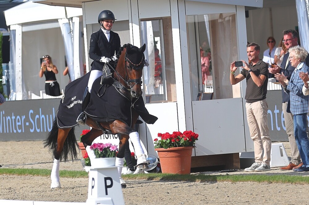 Die Besitzerin von Viva Diamond OLD ist Judith Köppel von 360° Sportpferde, Züchterin Anne Alberding hat die beeindruckende Stute aus der Birkhof’s Don Diamond-Tochter Zauberhaft gezogen. Zauberhaft und beeindruckend war auch die Fangemeinde hinter dem Paar Weiß-Viva Diamond. Mit bedruckten T-Shirts, einer Fan-Girlande, Fähnchen und lautem Jubel machten sie die Horse24-Arena zur Fanmeile für die Vize-Weltmeisterin und ihre Reiterin.