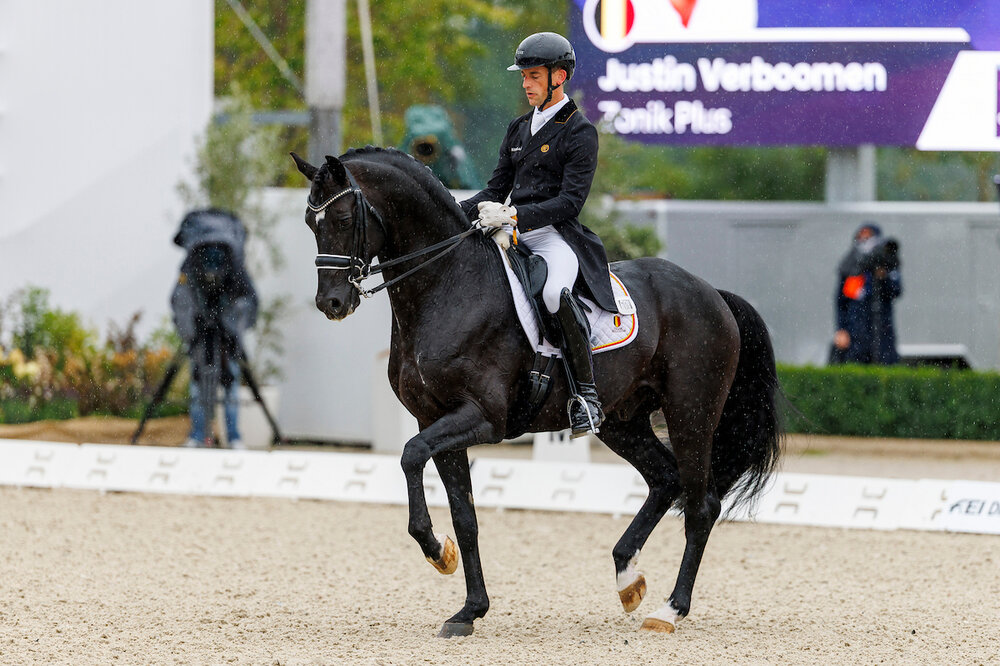 Es hatte sich bereits in den vergangenen Monaten und spätestens beim CHIO Aachen angekündigt: Der Belgier Justin Verboomen und sein bildhübscher Hengst Zonik Plus sind eine der neuen „Stars“ am Dressurhimmel. Sie vermitteln genau das, was gesehen werden möchte – oder besser gesagt, was erstrebenswert ist: Harmonie und Leichtigkeit in Perfektion. Es ist immer wieder beeindruckend, in welcher Selbstverständlichkeit der neunjährige Zonik-Nachkomme mit den Lektionen „spielt“ und in welcher Ruhe ihn Justin Verboomen „unterstützt“. Denn man darf nicht vergessen: Nicht nur der Hengst verfügt auf solch großem Parkett über kaum Erfahrung. Für seinen Reiter gilt das Gleiche. „Es ist das erste Championat für mich. Ich habe Schwierigkeiten, damit umzugehen, aber wir werden lernen“, gestand Justin Verboomen selbstkritisch.