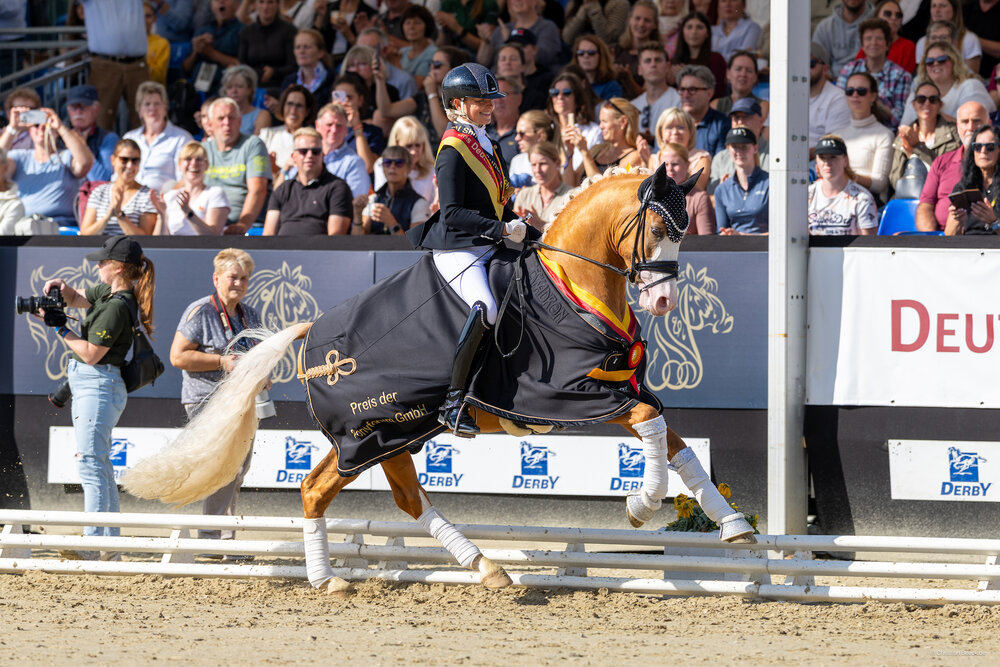 Der sonnige Samstagnachmittag brachte dem Reitpferdeviereck der Warendorfer DSP Arena vollgefüllte Zuschauerränge, die die Bedingungen für die noch so jungen Hengste durchaus erschwerten. Umso mehr zeigte sich, welcher Youngster bereits abgeklärt genug ist und den Umständen mit Coolness sowie während der Vorstellung durch hohe Rittigkeit mit seiner Aufmerksamkeit beim Reiter blieb. Einer dieser dreijährigen Reitponyhengste konnte dies gut demonstrieren. Denn trotz einer kleinen anfänglichen Spannung, gelang es Danica Duen die Konzentration ihres Next Temptation (Rhld) wieder auf sich zu lenken. Auch wenn die Vorstellung in der Qualifikationsprüfung noch etwas mehr Eindruck hinterließ, da der Palominohengst sich heute doch etwas beeindruckt zeigte, konnte er durch seine Qualitäten dennoch ausreichend Punkte sammeln, damit der Champion-Titel seiner wurde. „Formschön, muskulös, toll konstruiert“ – ein Reitponyhengst, wie er im Buche steht. Mit dieser Beurteilung für sein Exterieur hatte der Sohn des FS Next Champion-FS Champion de Luxe die Höchst-Teilnote von 9,5 in der Prüfung verzeichnen können. Nach kleinen Abzügen aufgrund der leicht aufgekommenen Spannung – „meckern auf höchstem Niveau“, wie Richter Gerd Wolfgang Sickinger in seinem Kommentar klarstellte, verblieben für den Trab, Galopp und die Rittigkeit je eine 8,5. Für den sehr guten Schritt sei nichts anderes möglich gewesen als eine 9,0 zu vergeben. So hatte Next Temptation in Summe eine 8,8 und den Sieg des Finales verdient. Damit hatte der Hengst aus der Zucht von Wim Engelmeers ihm und seiner Besitzerin, die selbst im Sattel Platz genommen hatte, Danica Duen allen Grund zur Freude gegeben.