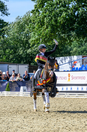 Allerdings kam der zweitplatzierte Grenzhoehes Negretto nah an dieses heran. Mit einer 8,9 in Summe wurde der Rapphengst von Numero Uno-Olivier K (Z. u. B.: Sabine Reimers-Mortensen) unter Linda Boller zum Vize-Champion. Die Höchstnote 10,0 vergaben die Richter für die überdurchschnittliche Rittigkeit. Und auch im Exterieur (9,0) sowie den Grundgangarten (Trab: 8,5 - Galopp: 9,0 - Schritt: 8,0) wurde Negretto belohnend bewertet. Auch wenn der Name es anders erwarten ließe, gab es für Der Goldjunge AT NRW im heutigen Finale zwar nur den Bronze Rang, aber trotzdem Grund zu Freude für seine Reiterin Jaqueline Schurf und den Züchter sowie Besitzer Adolf Theo Schurf. Denn mit einer 8,7 war der rheinisch gezogene Palomino als drittbester Reitponyhengst der Vierjährigen aus diesem Bundeschampionat hervorgegangen.