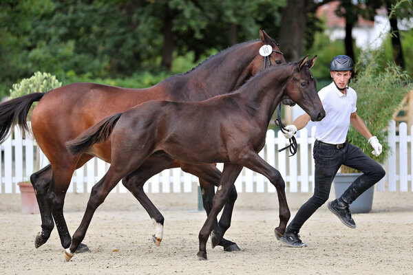Preisspitze der Auktion in Darmstadt-Kranichstein anlässlich der Bundesstutenschau war das Hengstfohlen Fliedergold v. Eichengold-Helium-Cadeau, aus der Zucht von Karl Skupin, Lübeck. In einem spannenden Bieterduell setzte sich ein Kunde aus der Schweiz durch und ersteigerte den bewegungsstarken Fliedergold für 27.000 Euro. Seine Mutter ist die Schwester des gekörten Fairmont Hill v. Singolo. Aus dem Stamm kommen unter anderem die gekörten Hengste Ferrari Forever v. Helium, Körsieger 2019, Finckenstein TSF v. Latimer, Grand Prix-erfolgreich mit Rikke Svane, DEN, Avec Plaisir v. Averner sowie Fahnenträger II v. Grandezzo.