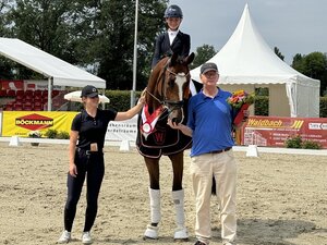 Ein Hannoveraner als Sieger in einer Serie für vierjährige DSP-Springpferde? Das lässt das Reglement zu, wenn das besagte Pferd auf einer DSP-Veranstaltung gekört und vermarktet worden ist. Das trifft auf Elton zu, der in München süddeutsch gekört und vermarktet worden ist – nämlich an das Haupt- und Landgestüt. Ein guter Fang, wie man weiß. Die Jury, bestehend aus Helmut Hartmann und Peter Bort, setzte den herrlich basculierenden und kräftig abdrückenden Hengst unter Richard Vogels Bereiterin Pia-Luise Baur mit 8,8 auf Rang eins. Richard Vogel hatte den Hengst, der sein feines Blut aus der anglo-arabischen Mutterlinie (über Ludwig von Bayern) schöpft, im Mai in Ladenburg qualifiziert. Elton (ohne John) aus der Zucht von Jens Löhden steht als DSP-Prämienhengst normalerweise auf der Deckstation in Biberach, wird von Pauline Jopp gearbeitet – ein kurzes Training für die Turnierreiter genügt. Der Hengst bringt großes Vermögen und viel Einstellung mit in den Sport. „Elton ist absolut eine coole Socke, so abgeklärt mit seinen vier Jahren, und ich freue mich immer wieder, ihn reiten zu dürfen“, erklärte Pia-Luie Baur nach ihrem Sieg.