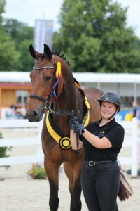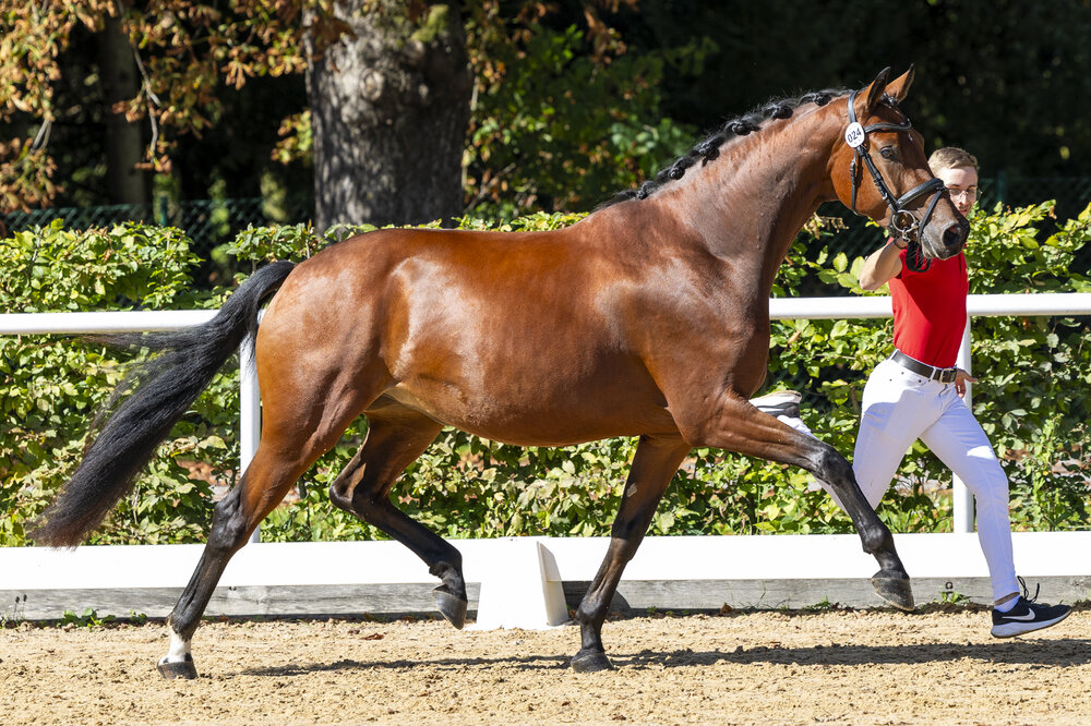 Bei den springbetonten Jungstuten triumphierte die 3-jährige Geyer’s Confetti v. Chacoon Blue. Mit einer herausragenden Freispringvorstellung (Note 9,2) und einem Gesamtergebnis von 8,1 ging der Sieg an das Haus Geyer.