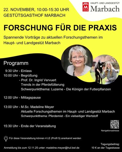 Am Samstag, den 22. November 2025, findet im Gestütsgasthof Marbach die Veranstaltung „Forschung für die Praxis“ statt.