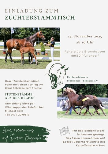 Am Freitag, den 14. November 2025 um 19 Uhr lädt der Pferdezuchtverein Pfullendorf-Bodensee e. V. zum Züchterstammtisch ins Reiterstüble Brunnhausen nach 88630 Pfullendorf ein. Der bekannte Hippologe Claus Schridde, u. a. Redakteur der bekannten Fachzeitschrift ZÜCHTERFORUM, hält einen Vortrag (Powerpoint-Präsentation) zum Thema „Stutenstämme der Region“. Dabei kommen auch die anwesenden Züchter zu den jeweils dargestellten Stämmen ihrer Zuchtstätten persönlich zu Wort. Behandelt werden einige hannoversche, holsteinische, aber auch bodenständige Württemberger Mutterstämme und solche mit Vollblutursprung. Für das leibliche Wohl ist gesorgt. Gäste sind gern gesehen. Um Anmeldung per Whatsapp oder Telefon wird gebeten: 0174/2079315 (Michael Kahl).