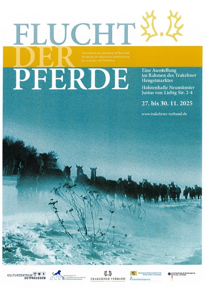 Im Rahmen des Trakehner Hengstmarktes findet vom 27. bis 30. November 2025 in der Holstenhalle zu Neumünster, eine Ausstellung mit besonderem historischem Hintergrund statt. Unter dem Titel „Die Flucht der Pferde“ leistet der Trakehner Verband einen Beitrag zur geschichtlichen Erinnerung an die Flucht aus Ostpreußen vor 80 Jahren, welche in diesem Jahr in zahlreichen Medien bundesweit Berücksichtigung findet.