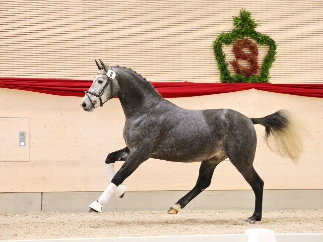 Prämiert wurden vier Kandidaten, und zur feierlichen Eröffnung der Reithalle setzte die Kommission ein leuchtendes Zeichen: Zum ersten Mal stand ein Schimmelhengst an der Spitze, und was für einer! Der ausgesprochen plastisch formierte Sohn des Eduscho (M. v. Indygo-Valerius-Enzian, Z. u. B.: Landwirtschaftsbetrieb Georg Lichthorn, Kamenz) schaffte gewissermaßen einen Start-Ziel-Sieg, denn vom ersten Augenblick an zog der pfiffige Schimmel alle Blicke auf sich. Ein unheimlich elastisches Pferd, mit enormer Präsenz und Ausstrahlung, der eine Beschälerbox im Landgestüt Moritzburg beziehen wird. Neben weiteren Ehrenpreisen gab es für den Züchter des Siegerhengstes den seit 2020 ausgelobten Wanderehrenpreis, ein großformatiges Ölgemälde des Hengstes Elbcapitän vom Künstler Manfred Busemann, der nun für ein Jahr einen Ehrenplatz im Hause Lichthorn haben wird.