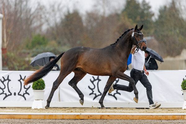 Der 63. Trakehner Hengstmarkt startete mit Kälte und Dauerregen bei der Pflastermusterung mit deutlich unwirtlichen Bedingungen, so dass das Publikum nahezu vollständig zur Liveübertragung in die geheizte Holstenhalle wechselte.