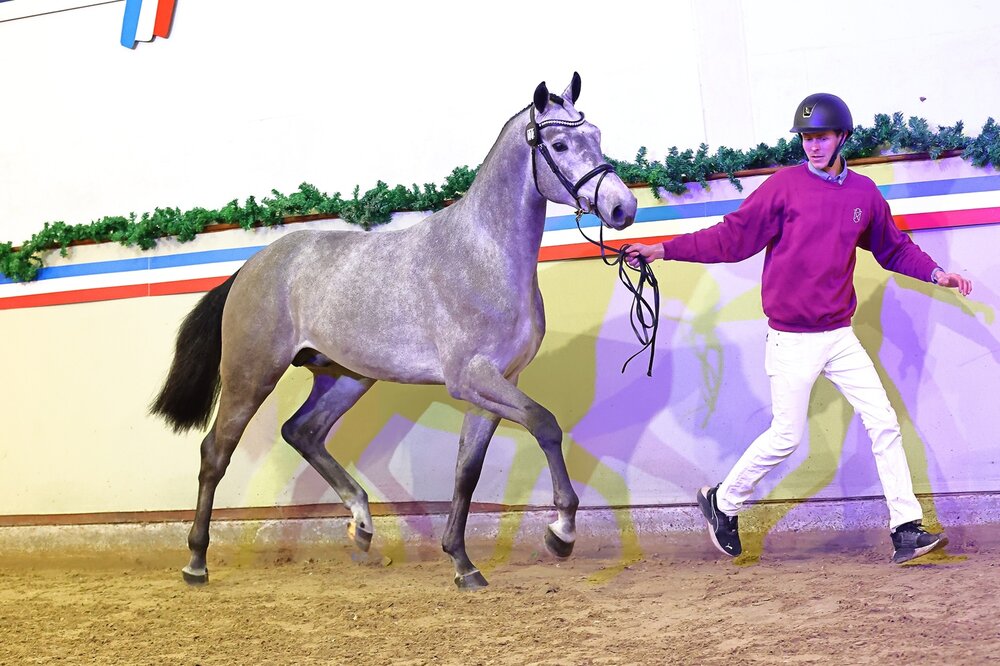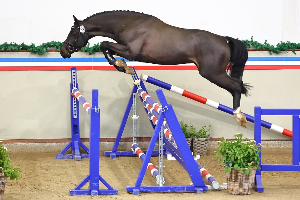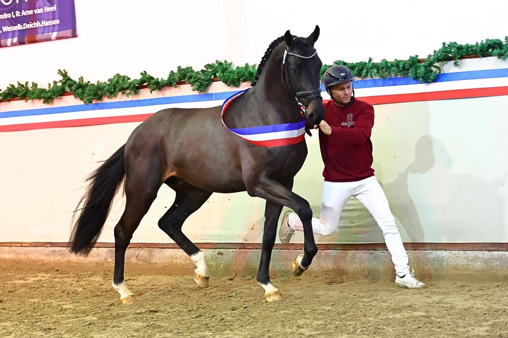 Er verbindet zwei der prägendsten Holsteiner Hengste der letzten zwei Dekaden, der frisch gekürte Holsteiner Sieger Dark Zuccero. Sein Vater Diarado verließ vor 18 Jahren die Holstenhallen in Neumünster als umjubelter Sieger seines Jahrgangs. Seine Mutter Zaresa, Holst. Stamm 4539, ist auch Mutter des Hengstes Zuccero HV und damit verantwortlich für die zweite Hälfte im Namen des aktuellen Siegers. Gezogen wurde Dark Zuccero, genau wie sein berühmter Halbbruder von Hanno Köhncke in Badendorf. Als Fohlen wechselte der Schwarzbraune in den Besitz der Holsteiner Verband Hengsthaltungs GmbH über, die sich gemeinsam mit dem Züchter nun als Aussteller des aktuellen Siegers freuen durfte. „Was für ein Pferd! In herrlicher dunkler Jacke, korrektem Körper, mit herausragendem Springen und natürlich fantastisch gezogen“, so beschrieb Zuchtleiter Stephan Haarhoff den noch jugendlichen und sich absolut altersentsprechend präsentierenden Sieger, der der Holsteiner Zucht erhalten bleiben wird und nicht in der Auktion zur Disposition stand.