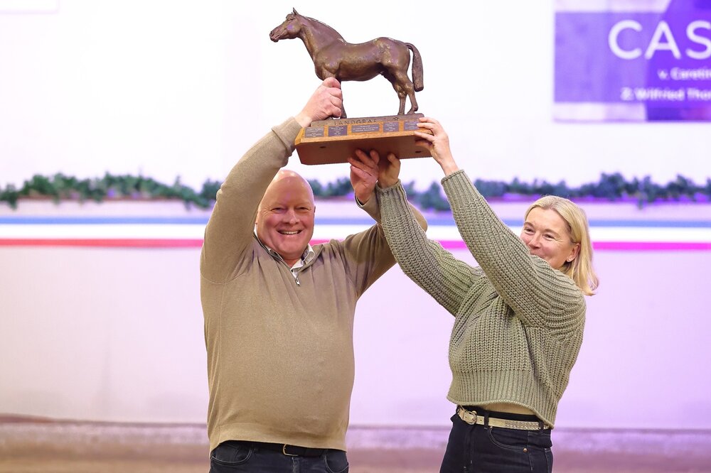Neben den Jahrgangsspitzen wurden auch erfolgreiche Holsteiner Züchter geehrt. Als Holsteiner Züchter des Jahres erhielt das Ehepaar Peters den begehrten Wanderpreis, eine Statue des Hengstes Landgraf, besonders für die Zucht des erfolgreichen Bull Run’s Jireh von Uriko.