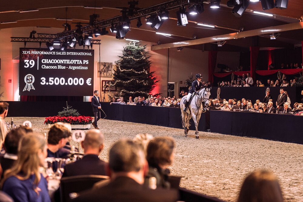 Bereits das fünfte Pferd im Auktionsring sorgte für einen historischen Moment: Die sechsjährige Schimmelstute Chacoontilotta PS (v. Chacoon Blue) durchbrach nicht nur die magische Millionengrenze, sondern stieg in einem intensiven Bieterduell gleich auf 3,5 Millionen Euro. Die Tochter des unvergessenen Chacoon Blue hatte unter Zascha Nygaard (DEN) bereits international auf sich aufmerksam gemacht. Ihre außergewöhnliche Elastizität, Technik und ein beeindruckender Springinstinkt machen sie zu einer außergewöhnlichen Kandidatin für den ganz großen Sport.