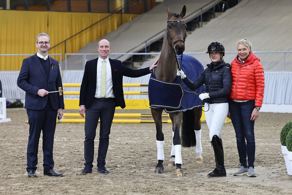 Gleich das erste Pferd, das versteigert wurde, setzte die Bestmarke. Der 2015 geborene Fahrenheit/Rubin-Royal-Sohn Fahr-Well (Z. Ludwig Knoll, Ostrach, Ausst.: Gestüt Tannenhof, Heidenrod), der auf eine Vollblutstute zurückgeht, hat bereits Erfolge bis Inter I zu verzeichnen und war einer Dressurreiterin aus Hessen 110.000 Euro wert.